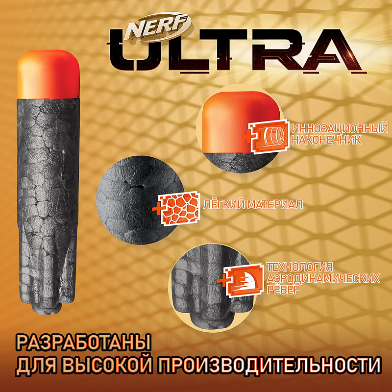 - В набор входит 60 стрел Nerf Ultra с инновационным наконечником и технологией Aerofin и пеной Nerf Ultra