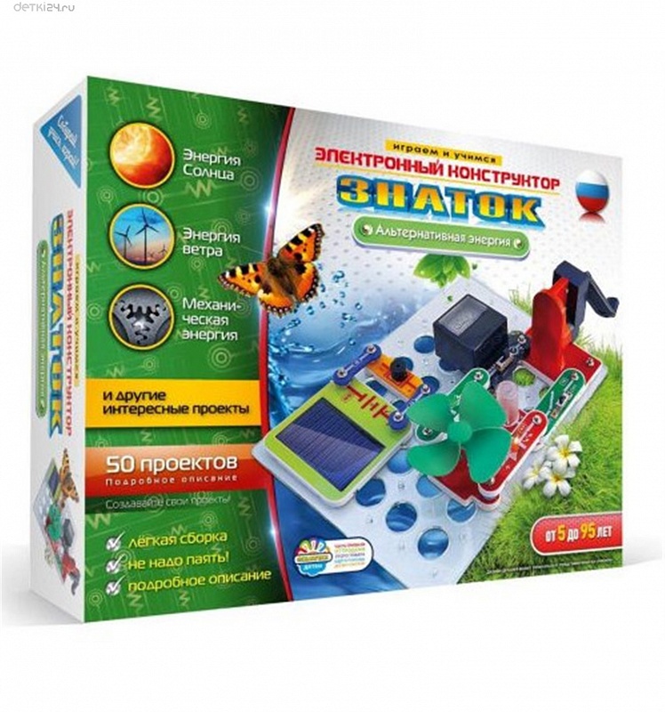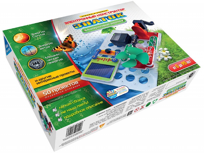 При желании, Вы можете сами придумать новые проекты и собрать их. Помимо этого в прилагаемой книге вы найдёте перечень и описание элементов конструктора. Все элементы данного конструктора совместимы с другими электронными конструкторами серии ЗНАТОК™ Рекомендуемый возраст: от 5 лет. Абсолютная безопасность и простота сборки – не надо паять! Охрана окружающей среды — это глобальная проблема, не имеющая границ и пересекающая все океаны! Для работы схем НЕ НУЖНЫ дополнительные источники питания – ни батарейки, ни аккумуляторы!