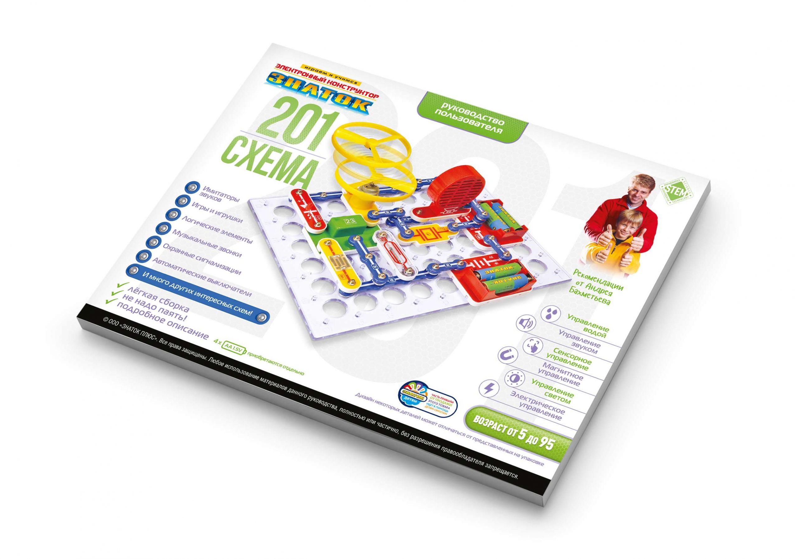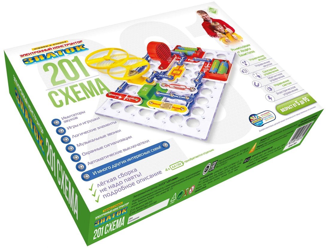 Электронный конструктор начального уровня, позволяющий ребёнку познакомиться с удивительным миром электроники. Даже без помощи взрослых, используя только очень понятное цветное руководство, всего за несколько минут, он или она смогут собрать одну из 201 схемы, на которые родители 10 лет назад тратили целые недели. 100% положительным результатом можно удивить родителей, друзей, учителей.