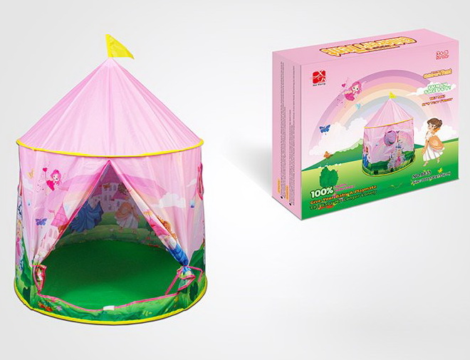 Палатка выполнена в форме замка в розовом цвете. В замке-палатке имеются окошки , а дверка собирается и завязывается по бокам с помощью верёвочек. В палатке есть днище — пол, что делает ее еще более комфортной для игр деток. Палатка легкая и прочная. Легко собирается и компактно складывается, удобна для транспортировки и хранения.