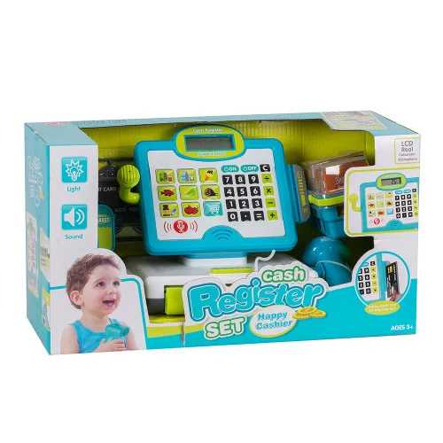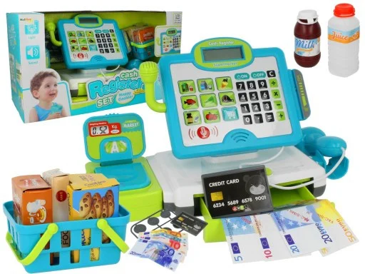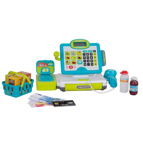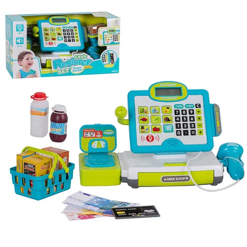 Касса с деньгами откроется только после нажатия соответствующей кнопки. Также в наборе присутствует функциональная платежная карта и деньги. Чтобы играть было еще интереснее в комплекте вы найдете целый набор свежих продуктов в корзинке. Игрушка работает от 2-х батареек типа «АА» 1.5V (не входят в комплект), размер 33-14-21 см.