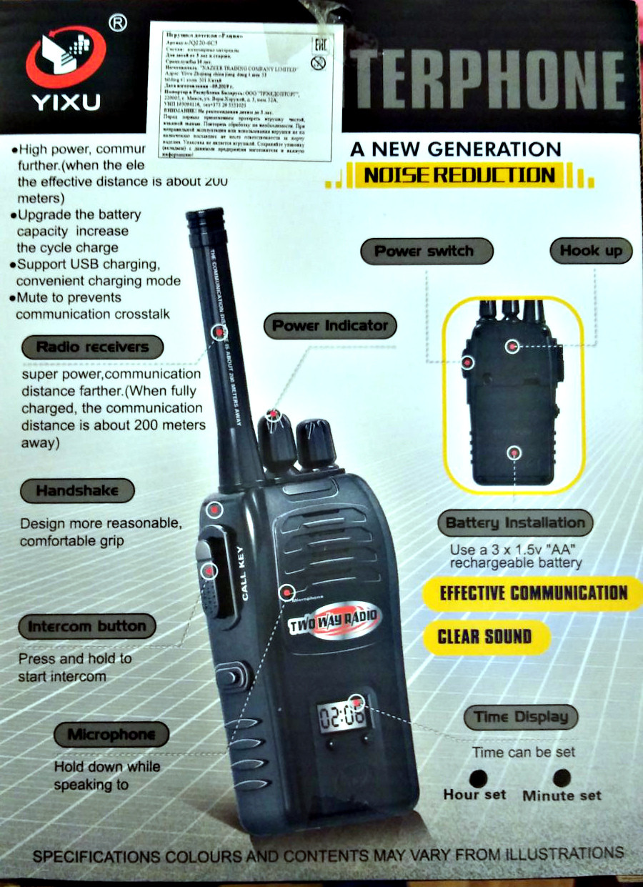 Несомненно, рация — атрибут полезный и интересный для игры, но может использоваться и для иных целей. Комплект рассчитан на 2-х человек, которые могут спокойно переговариваться друг с другом на расстоянии. Рации работают от аккумуляторов.