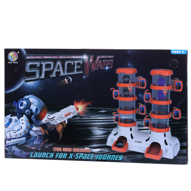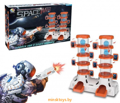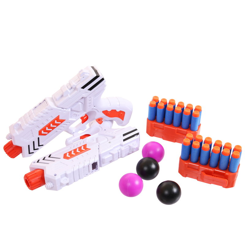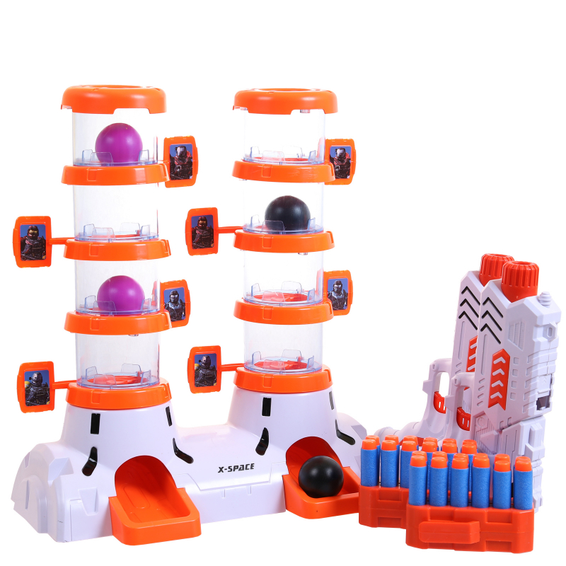 В составе набора тир, который состоит из двойной многоярусной мишени с шариками внутри и 2 бластеров, стреляющих мягкими пулями.