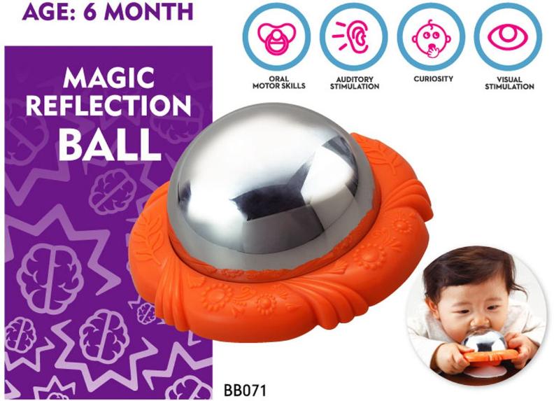 Любопытному крохе понравятся постоянно меняющиеся отражения на выпуклой поверхности волшебного мячика. С помощью присоски волшебный зеркальный мячик прочно крепится к большинству плоских поверхностей. Он удержится на месте, даже если ваш ребёнок будет хватать и дёргать его и ползать вокруг игрушки, изучая разные отражения.