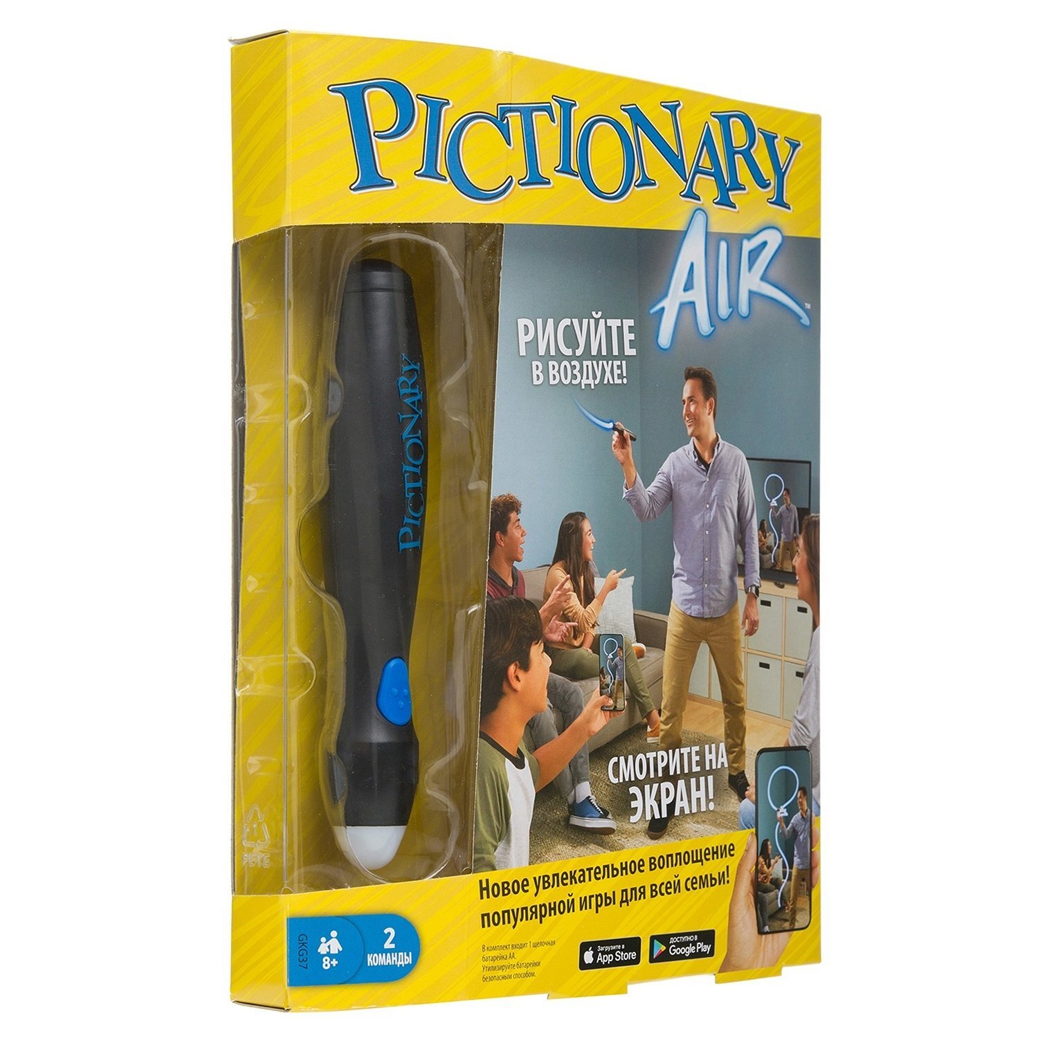 В комплекте: 1 ручка Pictionary Air, 112 двусторонних карточек подсказок, коробка для карточек и инструкции.