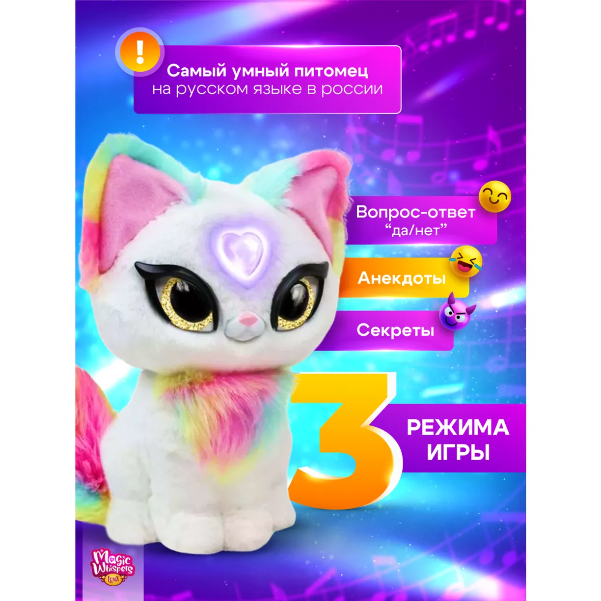 Говорящая кошечка Луна может отвечать на вопросы «да/нет», рассказывать шутки и делиться секретами. Когда она хочет поболтать с ребенком, сердечко-кнопка во лбу начинает сиять. Чтобы услышать, что говорит кошечка, нужно прижаться своим лбом к сердечку, и она расскажет свой секрет. Благодаря направленному динамику ее услышит только ребенок, а вслух игрушка просто мурчит. Очаровательная и яркая подружка-болтушка станет самым лучшим другом! Кошечка говорит на русском языке, издает более 100 звуков и 20 шуток. Переключать режим общения можно с помощью незаметной кнопки на ушке.
