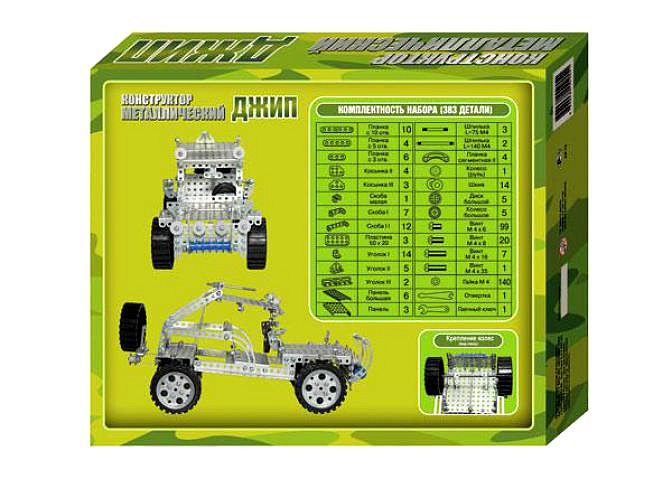 Детский металлический конструктор для мальчиков "Джип" состоит из 383 деталей и предназначен для "продвинутых конструкторов" от 6 лет и старше. Кроме металлических деталей в набор входят пластиковые и пластмассовые детали. Как и во всей серии конструкторов "Как раньше", конструкция достаточно сложная, поэтому , возможно, собрать ее получится не сразу.