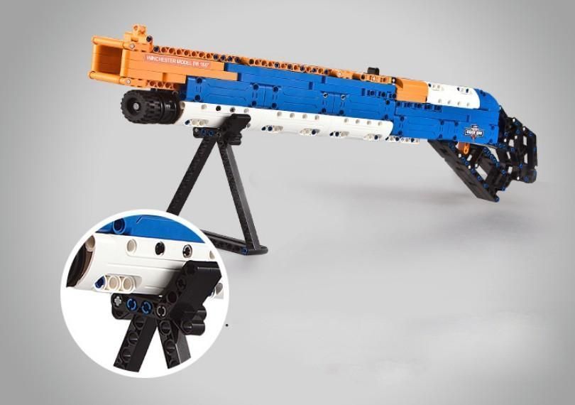 Полученный из деталей конструктора C81004 CaDA Винчестер. Модель 1887 макет достаточно функционален. В частности, у него можно открыть затвор, зарядить поролоновый патрон и закрыть. Ружьё готово к стрельбе – при нажатии спускового курка пуля вылетит из ствола. Для стрельбы лёжа, возможно прикрепить оружие на поддерживающую ствол ножку-треугольник. В комплекте конструктора всего пять патронов.