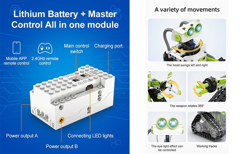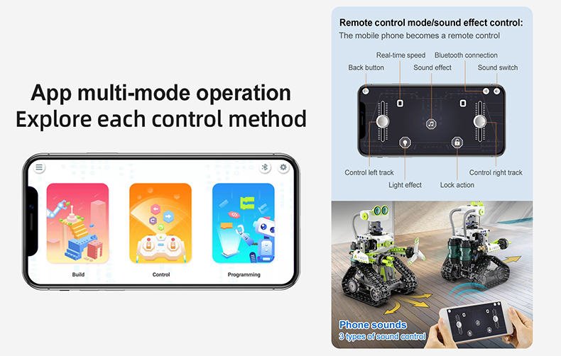 Управляйте роботом пультом управления или созданием своей собственной последовательностью команд с помощью смарфона и управления перетаскиванием.