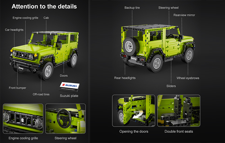 Сузуки Джимни SUZUKI JIMNY конструктор на радиоуправлении Cada Technic C51201 с двойным управлением позволяет выбирать между классическим радиоуправлением и приложением для телефона. открывающиеся двери с пружинами, задняя подвеска. Работающие фары при движении вперед. Работающие задние фары при движении задним ходом. Управление: WLAN 2,4 ГГц (пульт дистанционного управления), Bluetooth (через приложение для iOS/Android*)Функции пульта дистанционного управления: вперед, назад, влево, вправо, включение/выключение света. Примечание*: от iOS 13.0 / Android 8.0 или выше.