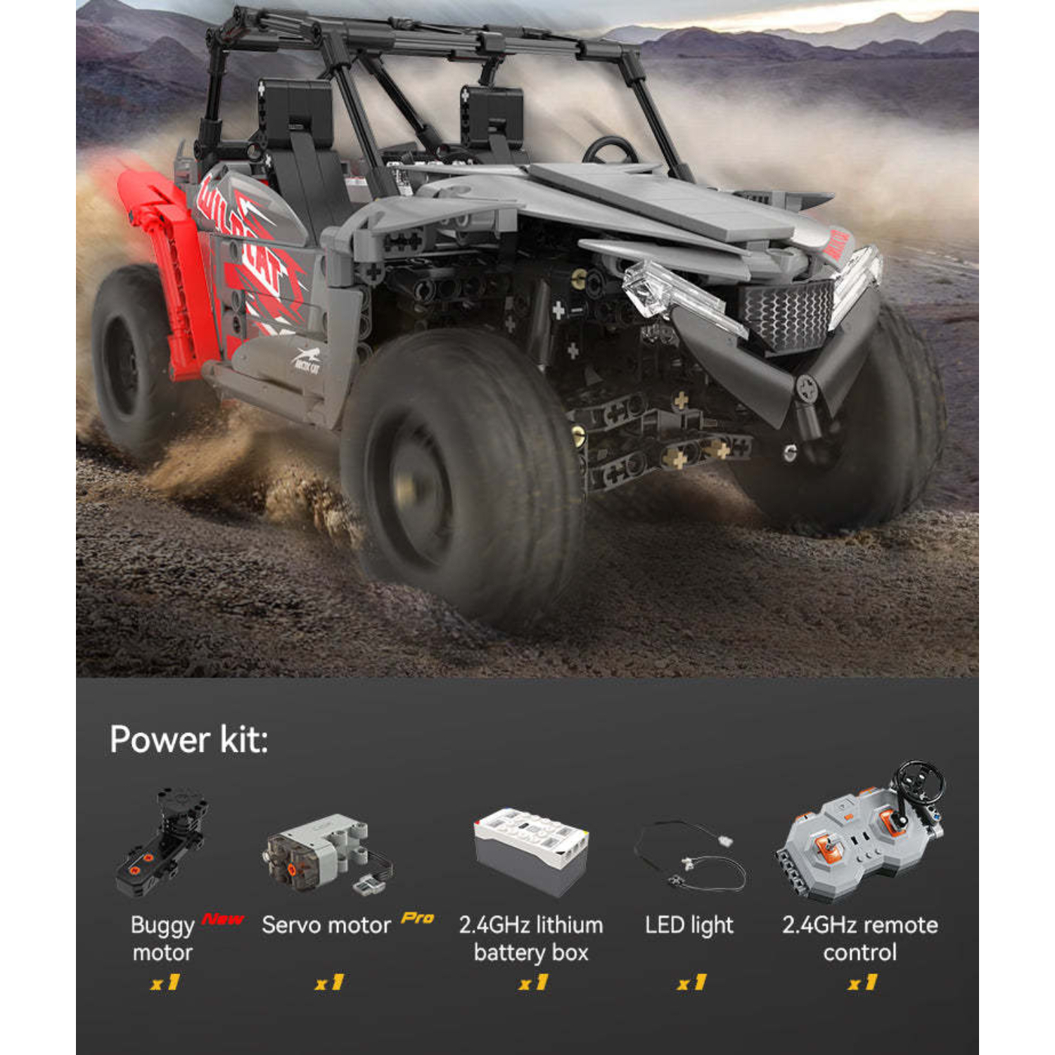 Конструктор включает в себя детализированную 4-колесную подвеску, которая справляется с любыми препятствиями. Прочный каркас обеспечивает безопасность и устойчивость модели во время движения. В комплект входит мотор и пульт дистанционного управления, позволяющий двигаться вперед, назад, а также поворачивать влево и вправо. Дополнительным преимуществом являются светящиеся фары, которые делают игру еще более увлекательной в темное время суток.
