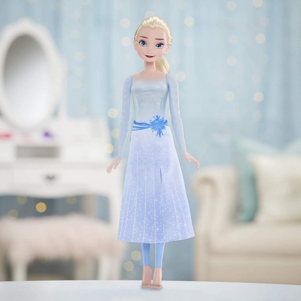 Классическая кукла Эльза в платье, в котором она боролась со зловещим бушующим темным морем, используя свои волшебные чары. Пластиковый топ платья светится в различной цветовой последовательности фиолетовыми и синими оттенками. При помещении в воду на юбке куклы проявляются красивые ромбовидные узоры.