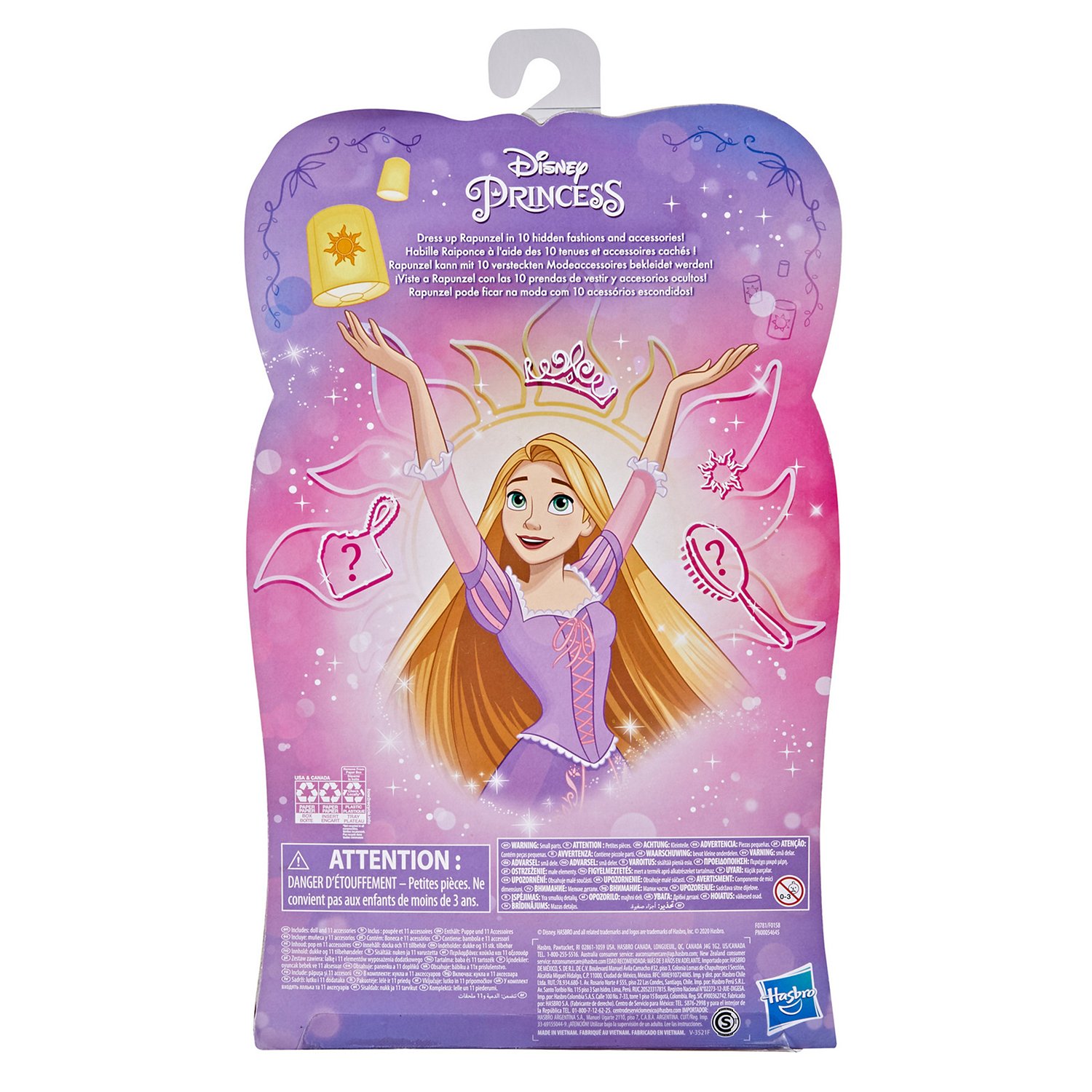 - Кукла принцессы Рапунцель идет в комплекте со различными предметами одежды и аксессуарами, которые спрятаны внутри секретных отделений в упаковке