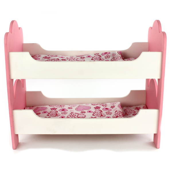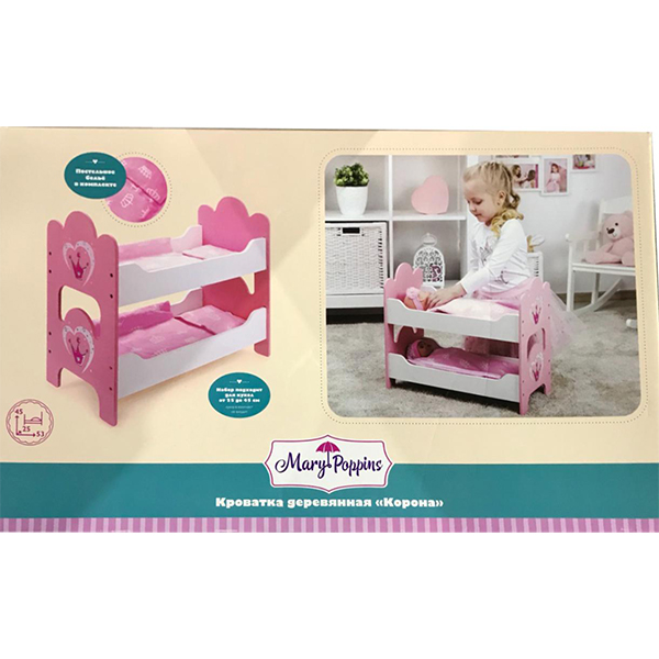 Розовые спинки выполнены в форме короны, постельное белье сшито из текстильной ткани с красивым узором в виде сердечек и цветов. Со стороны кровать смотрится как настоящая. Она изготовлена из натурального дерева, без зазубрин и шероховатостей.