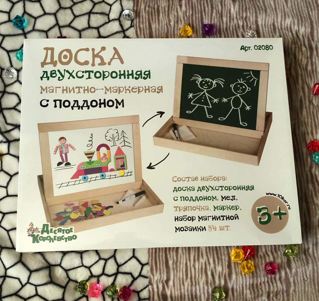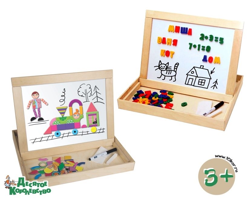 Состав набора: доска с поддоном, мел, тряпочка, маркер и комплект магнитной мозаики (84 элемента). Изготовлено из дерева, магнита, металла, пластмассы и текстильного материала. Рекомендованный возраст: 3 года +