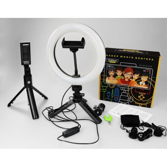Набор юного блогера 5 предметов. Состав набора- кольцевая светодиодная лампа с регулируемым освещением - 1 шт. (диаметр 20 см), настольный штатив-тренога для лампы с держателем для телефона - 1 шт., универсальный штатив монопод-селфи палка - 1 шт., аудио разветвитель переходник для микрофона и наушников (наушники в комплект не входят) - 1 шт., петличный микрофон - 1 шт., линзы для смартфона - 3 шт. (Fish eyes, широкоугольная, макро). Набор предназначен для подростков от 14 лет. Материал- ABS-пластик, металл, стекло, текстиль.