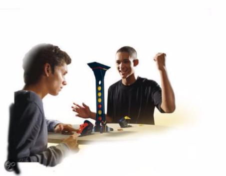 Комплект: 5 дисков красного цвета, 6 дисков желтого цвета, башня и 2 ножки-подставки, 2 пусковых устройства, 2 воронки, 1 фиксатор, лист с наклейками, инструкция.