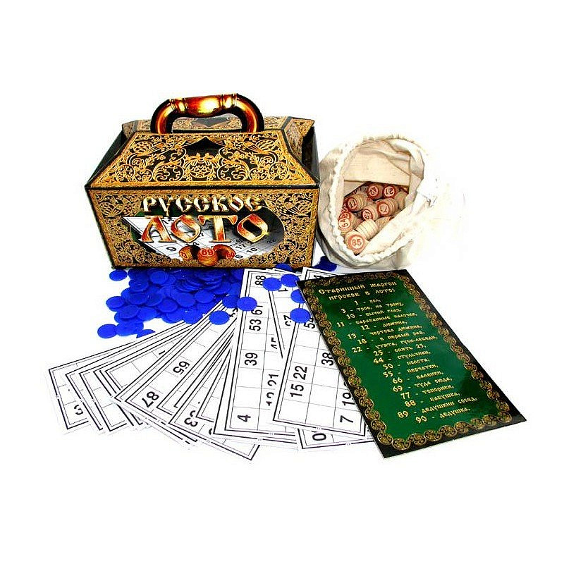 Лото, полностью соответствующее русским традициям и современными стандартами, вы можете купить в нашем магазине. В наборе вы найдёте всё для игры: мешочек с традиционным узором, 90 качественных деревянных бочонков, правила, 24 карточки, 100 жетонов для закрывания чисел на карточках, а также словарик со старинным жаргоном игрока в русское лото.