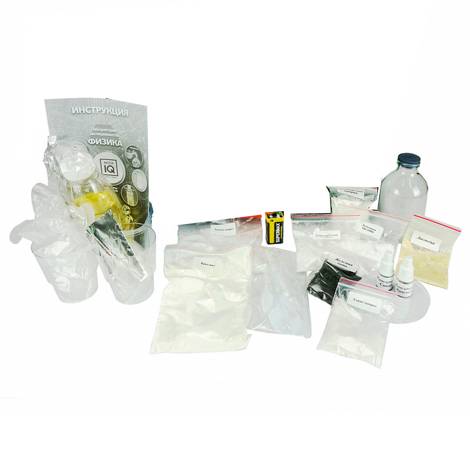 Комплектация: Пипетка, Бутылка пластиковая, Флакон стеклянный, Стаканы, Контейнер, Ложки(чайные и столовые), Чашка Петри, Батарейка типа «крона», Флаконы с красителями, Фольга алюминиевая, Крахмал, Лимонная кислота, Гидрокарбонат натрия, Масло растительное, Ацетат натрия, Полиакрилат натрия, Железная вата, Ликоподий, Хлорид натрия, Инструкция, Перчатки