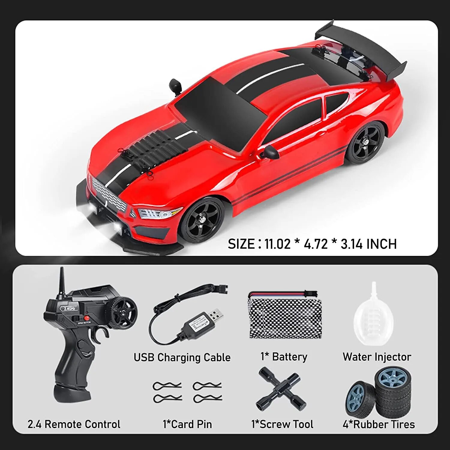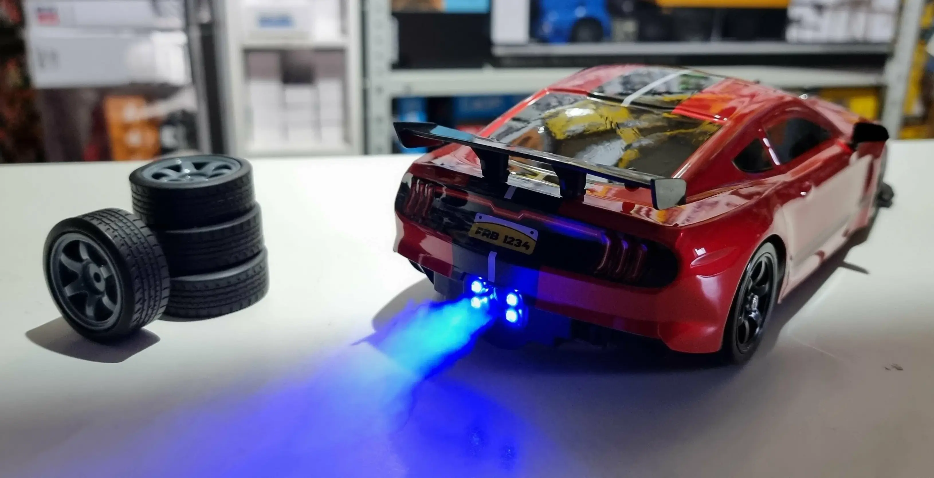 машинка для дрифта, пульт управления, ёмкость для воды, 2 комплекта колёс, ключ, аккумулятор, зарядное стройство |