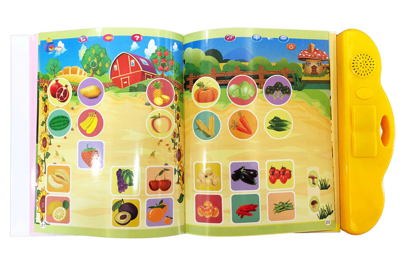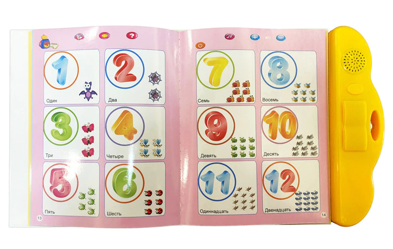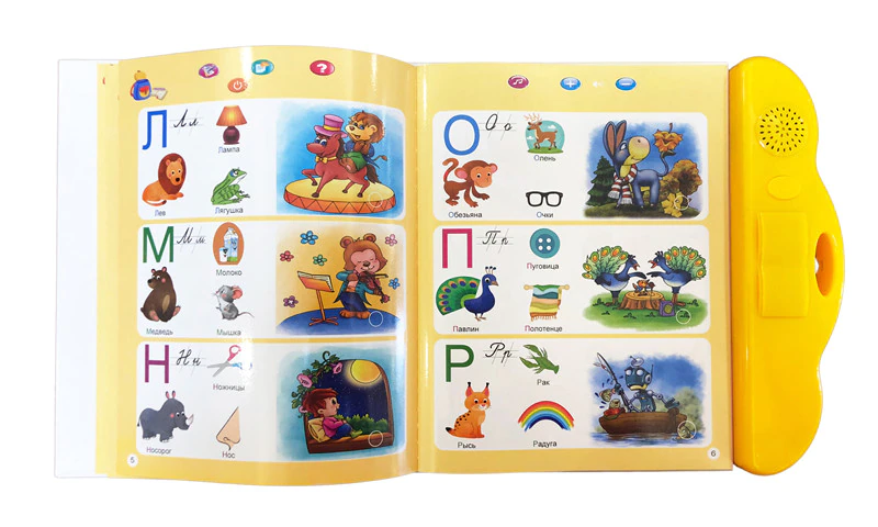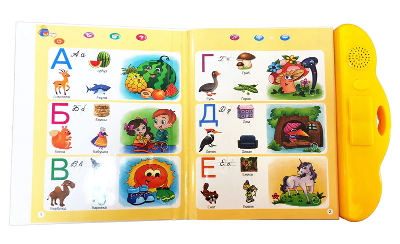 Развивающая игрушка "Говорящая книжка". Книжечка поможет в изучении букв, слов, стихов, цветов, форм, фигур, видов транспорта, овощей и фруктов, животных, предметов и сказок. Странички функциональные - для начала игры нужно нажать на кнопку включения сначала на пластиковой панели, а затем сверху странички (нажимать каждый раз после переворота странички). Есть функция проверки выученного. Озвучено на русском языке.