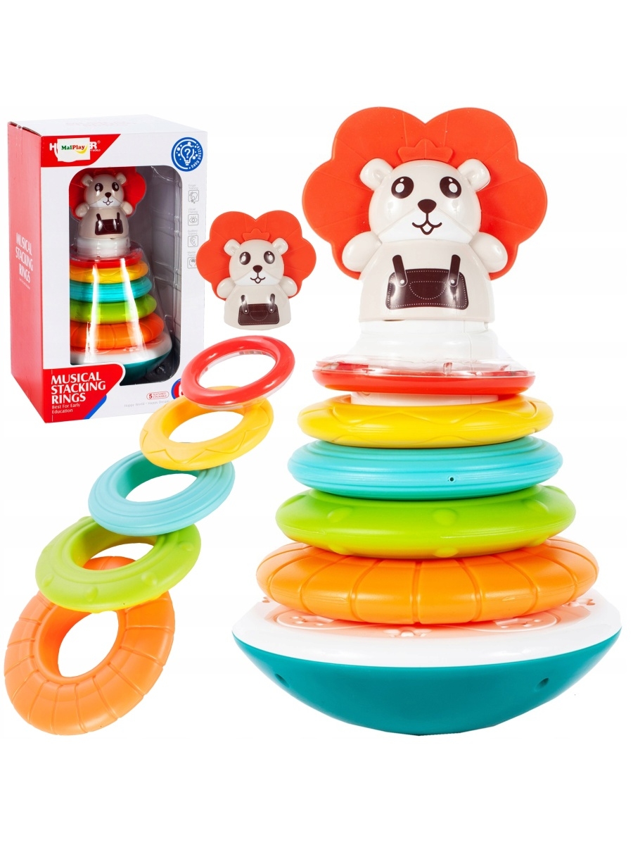 Пирамидальная башня имеет обруч для штабелирования. На вершине башни находится фигурка слона, уши которой сделаны из резины и могут использоваться как прорезыватель при прорезывании зубов. Верхний обод также является храповым механизмом, и обода можно устанавливать в любом порядке. Все это помещено на закругленное основание, которое откидывается вбок. Многие цвета и формы стимулируют зрительные стимулы ребенка, правильно развивая когнитивные двигательные навыки. При надевании обручей из игрушки доносятся разные звуки. При надевании обручей из игрушки исходят различные звуки, а после нажатия кнопки под питомцем раздаются короткие мелодии и звуки животных. Размеры продукта: 14,0 x 14,0 x 23,8 см. Размеры упаковки: 16,0 x 15,5 x 27 см.