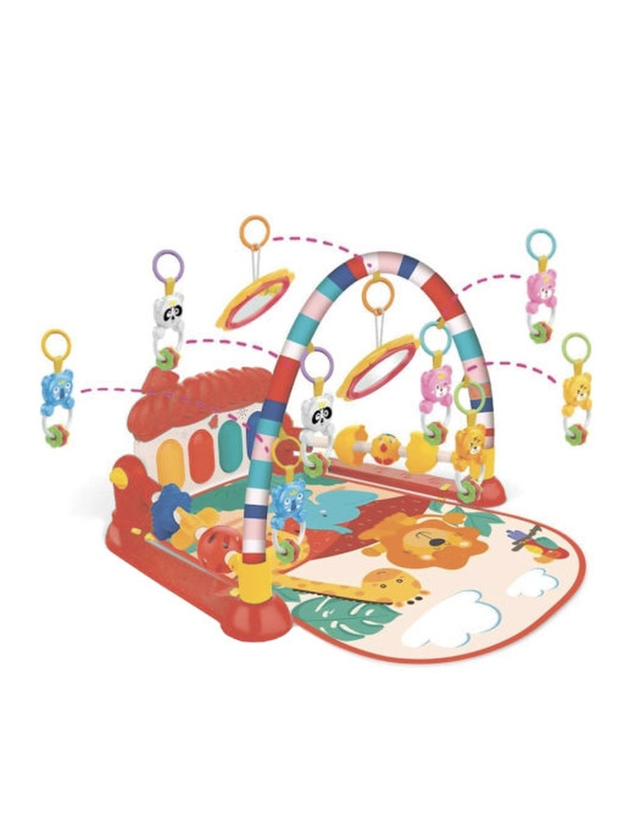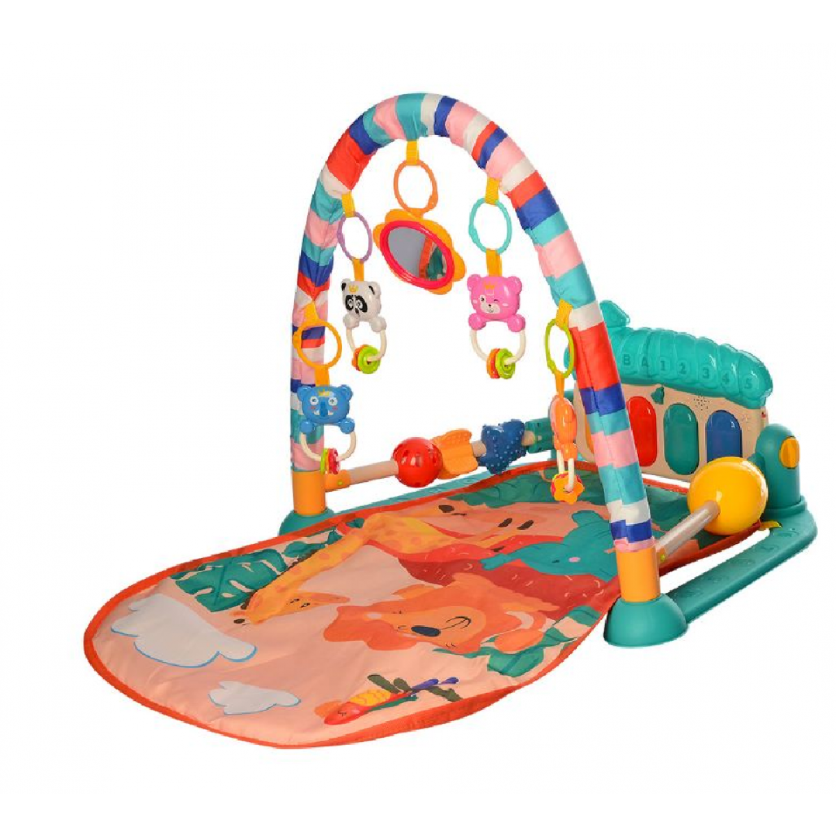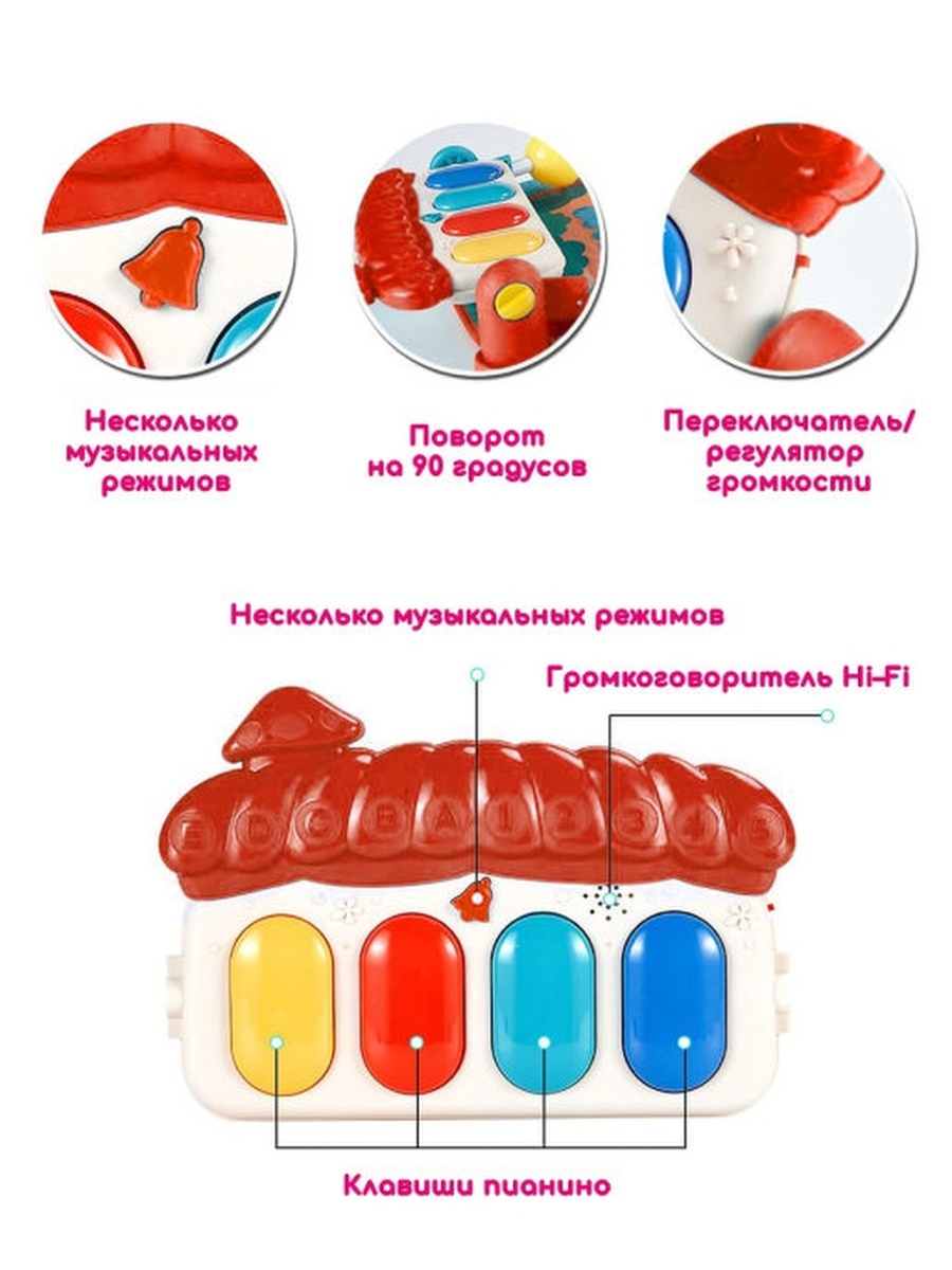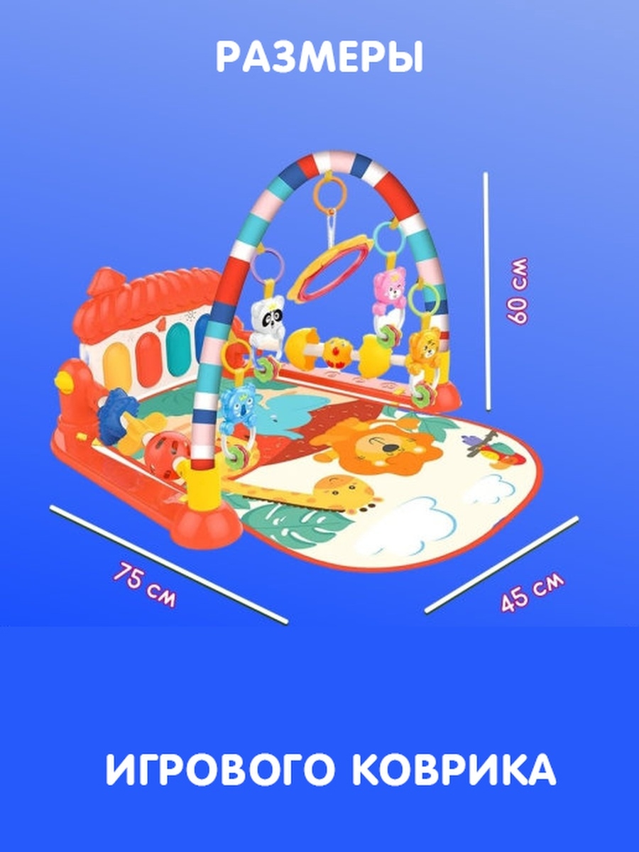 Коврик имеет интерактивное пианино, которое играет приятные мелодии и имеет световые эффекты. Пианино, входящее в комплект, можно отцепить и прикрепить к детской кроватке.