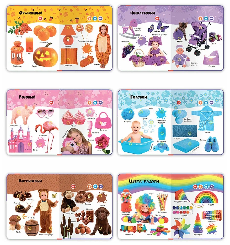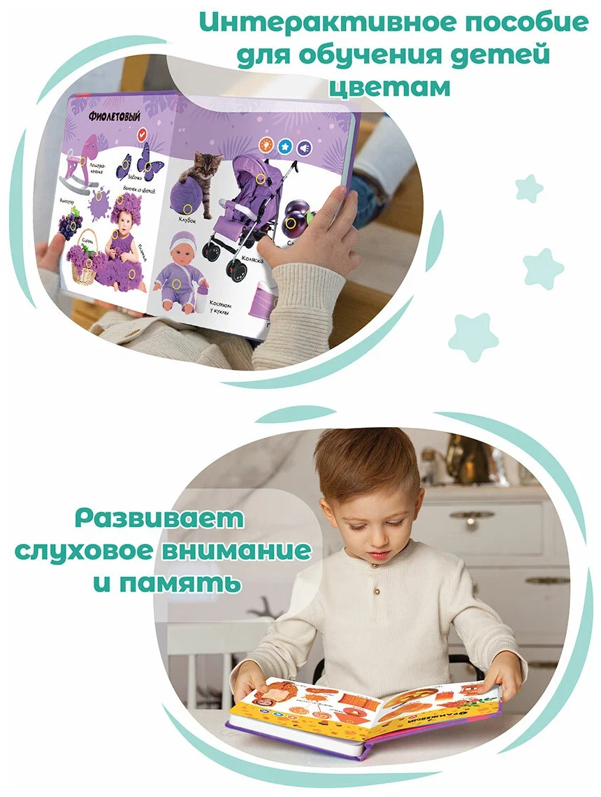 Интерактивные двусторонние страницы изготовлены из красочного картона и украшены яркими настоящими картинками, которые привлекут внимание детей и вызовут интерес к учебному процессу. На каждом развороте есть 3 режима: в первом режиме можно просто слушать названия цветов и различных предметов; во втором режиме можно узнать интересный факт о каждом изображении; в третьем режиме предлагается найти и показать определенный цвет или предмет. Каждый разворот также имеет регулировку громкости, что позволяет настроить звук под комфортные условия.
