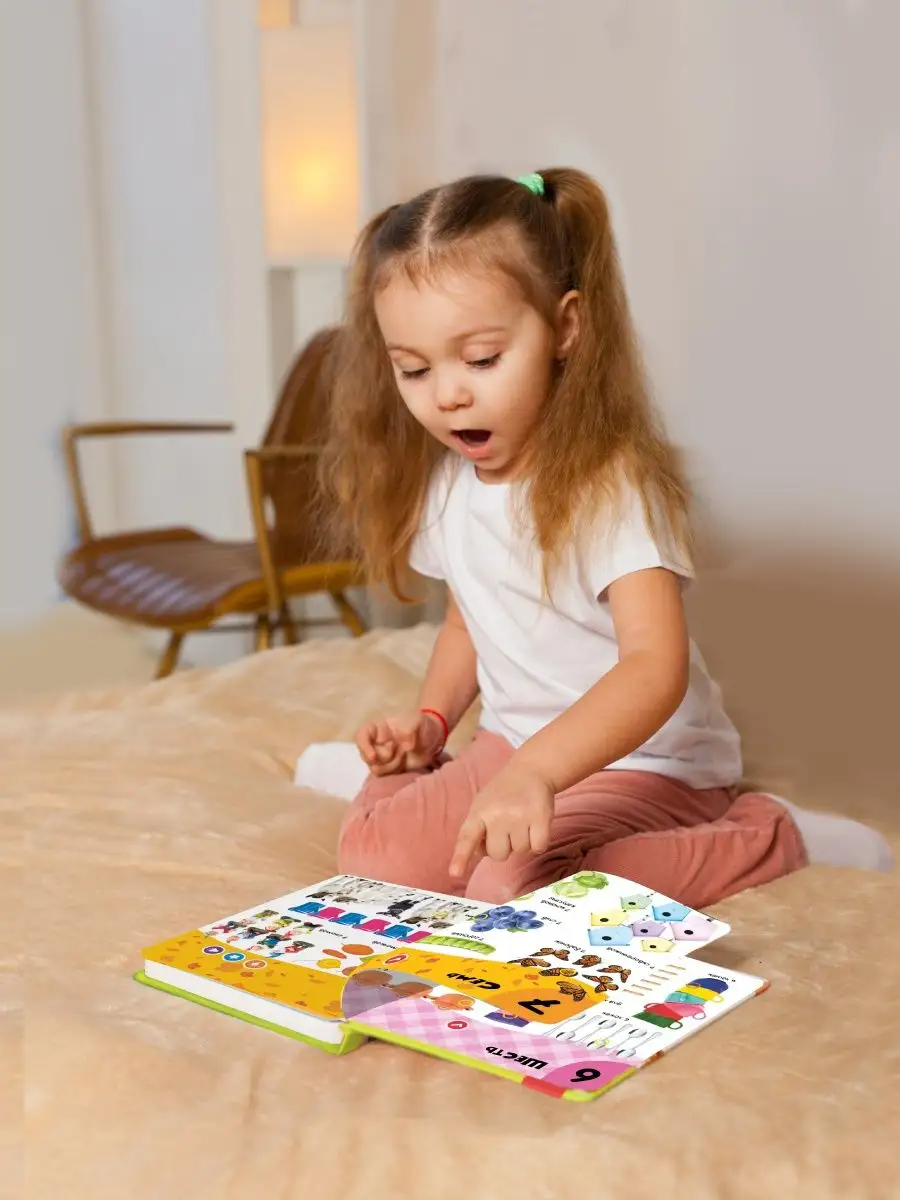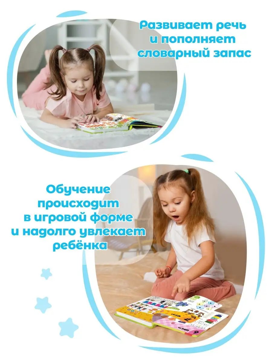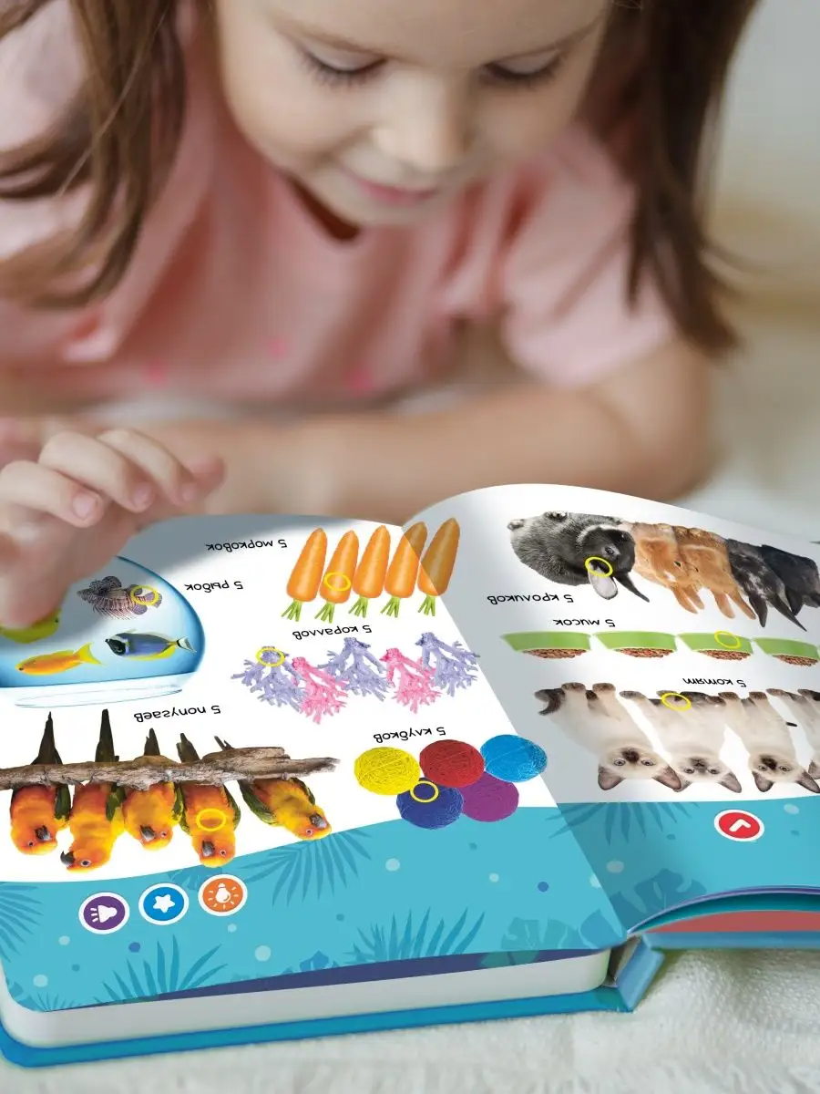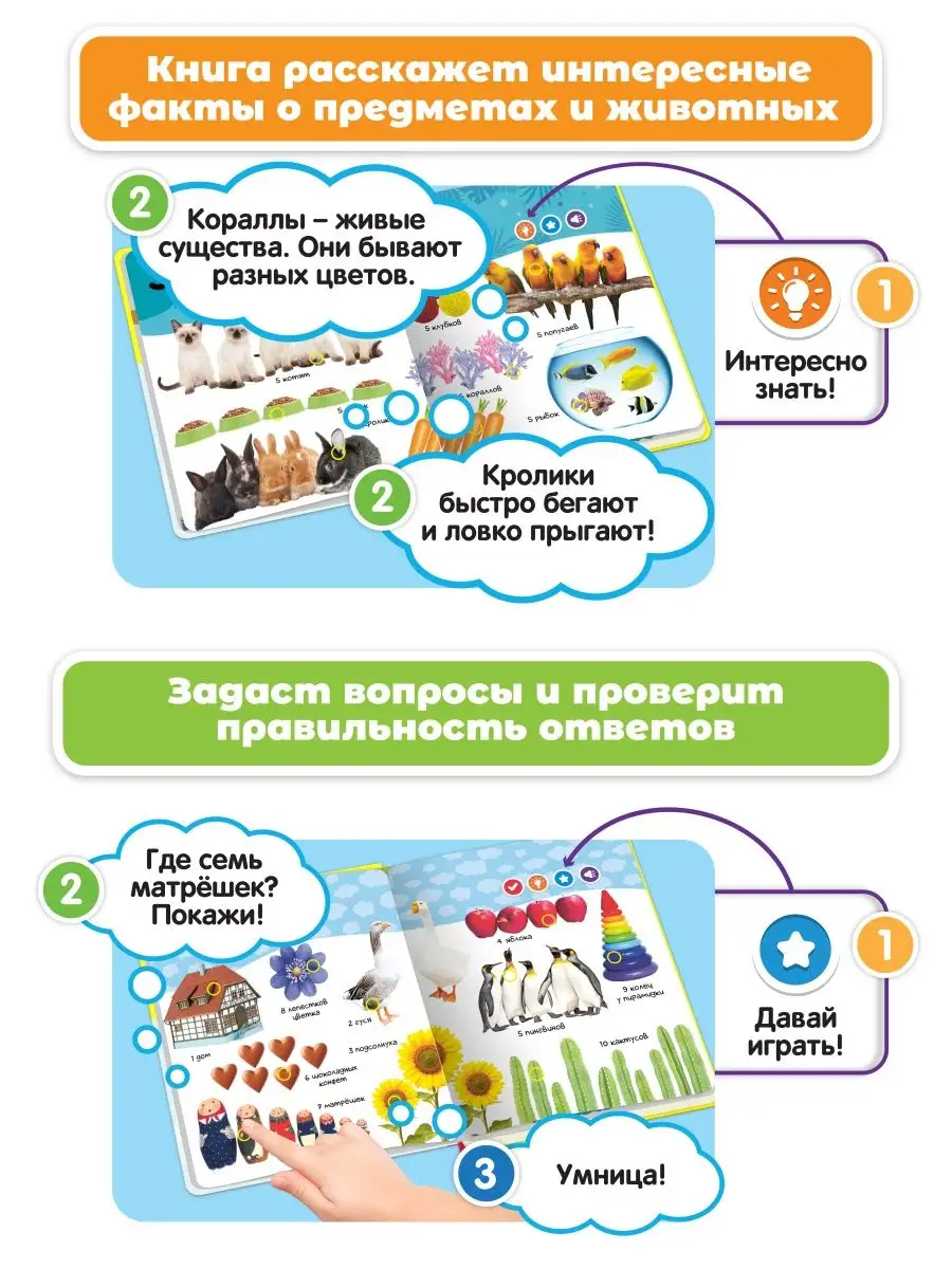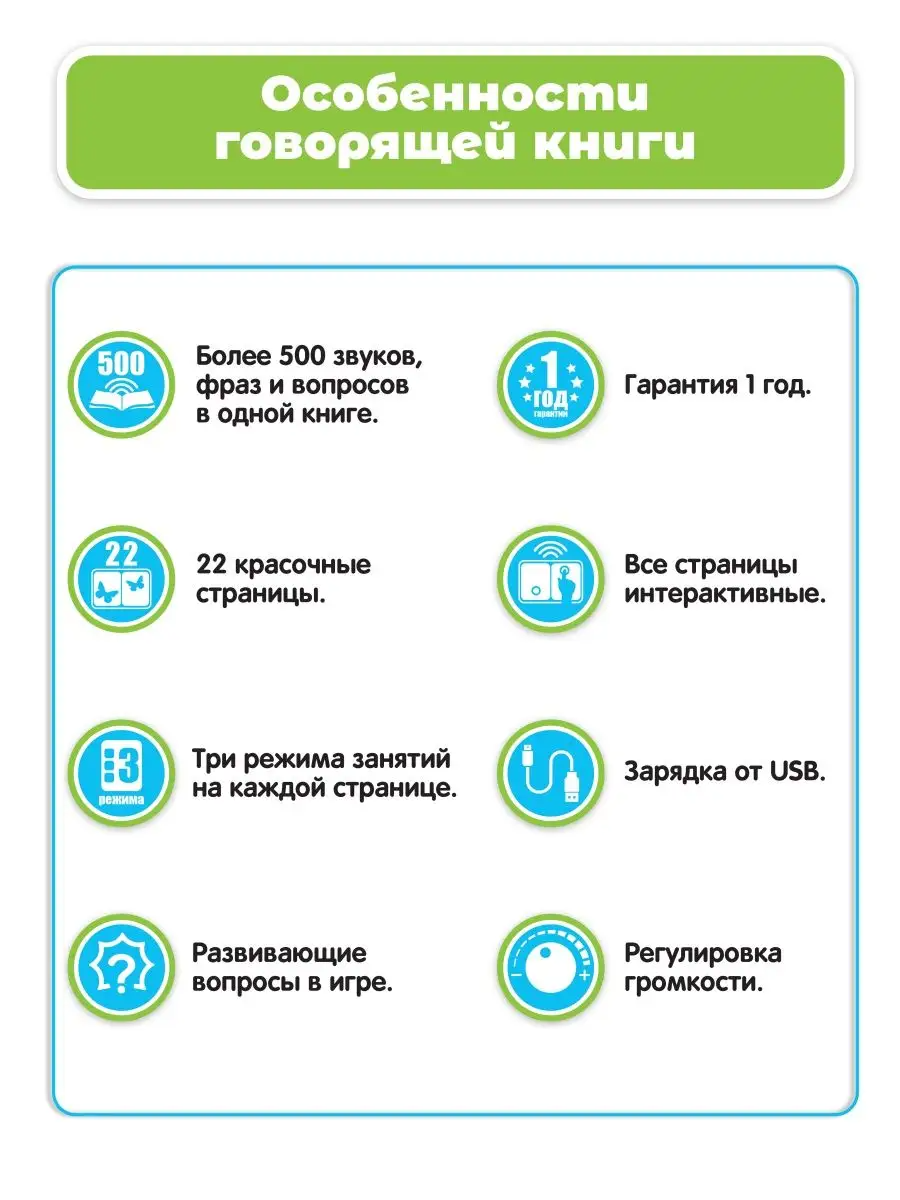 Книжка содержит 22 двусторонние интерактивные страницы, на каждой из которых представлены яркие и реалистические фотографии. Эти настоящие фотографии не только привлекают внимание ребенка, но и вызывают его интерес к обучению. Более 500 фраз и заданий на выбранную тему помогут ребенку легче запомнить информацию и получить новые знания.