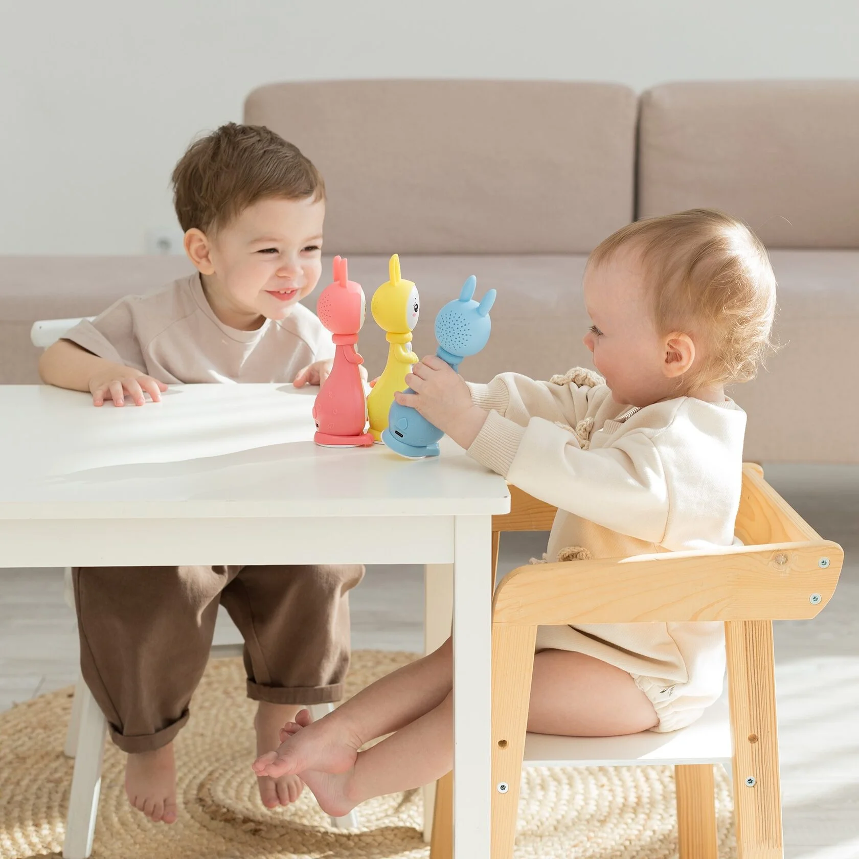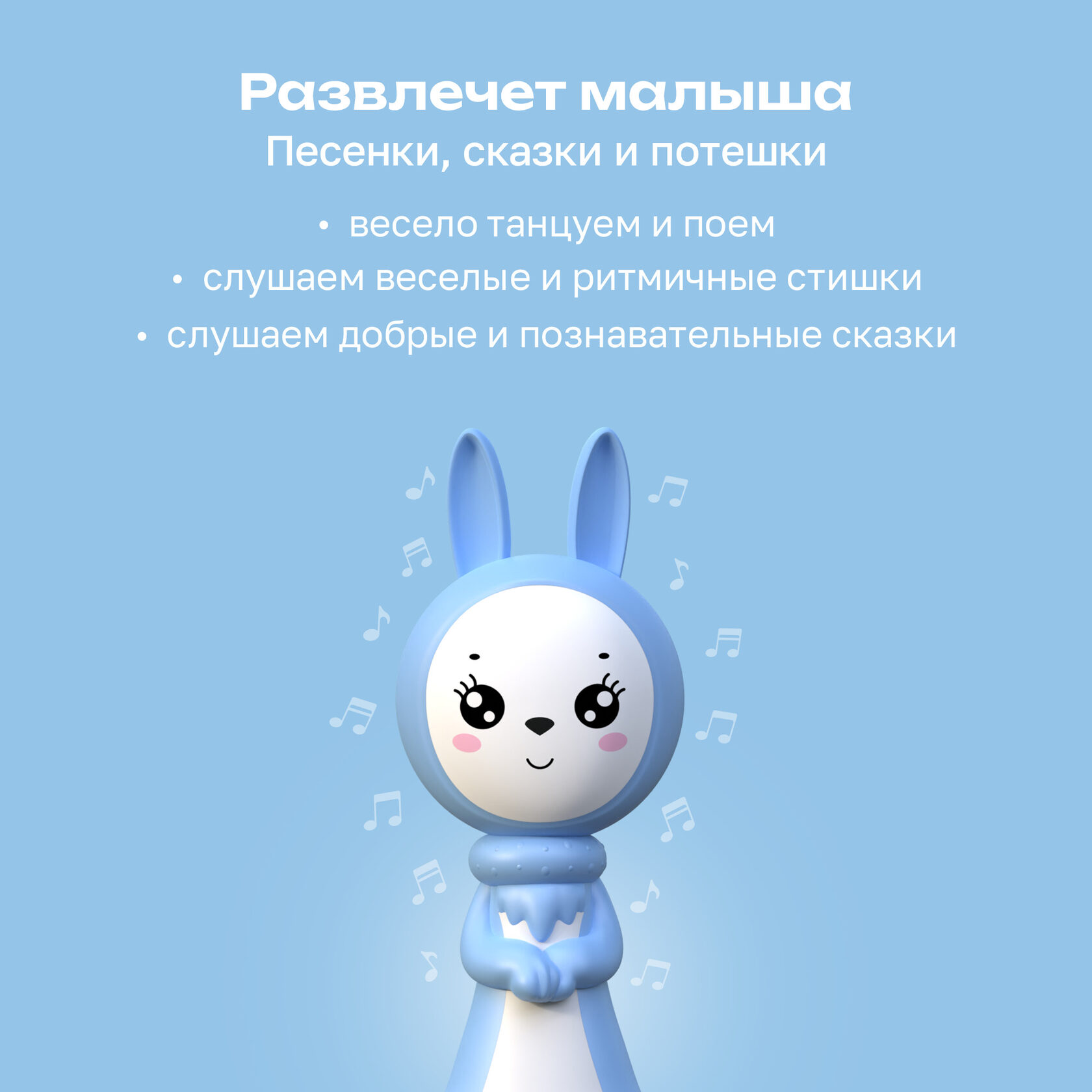 Игрушка оснащена прочными силиконовыми ушками-грызунками, которые успокаивают десны и помогают уменьшить боль при прорезывании зубов. Материал из силикона безопасен для здоровья и не вызывает аллергии. Корпус зайчика выполнен из прочного противоударного ABS-пластика, который выдерживает нагрузку до 8 кг. Удобные увеличенные кнопки позволяют ребенку легко переключать режимы игры.