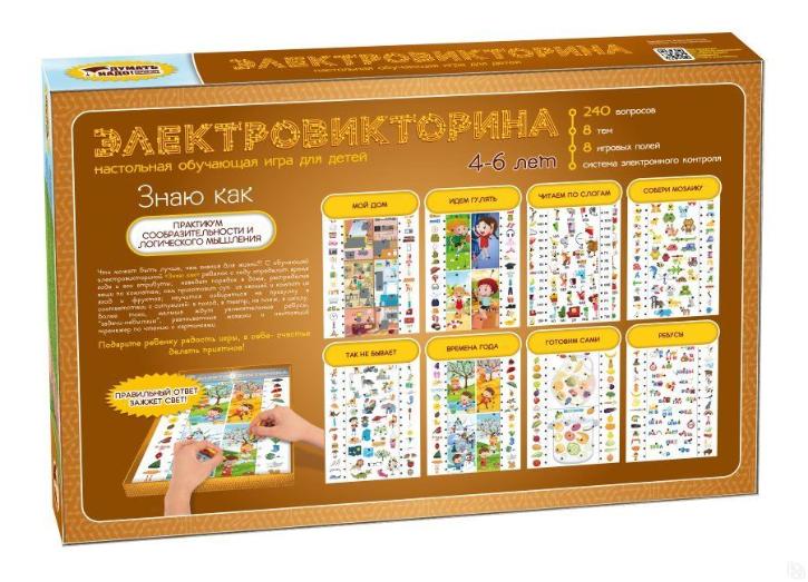 Что может быть лучше, чем знания для жизни?! С обучающей электровикториной «Знаю как» ребенок с ходу определит время года и его атрибуты; наведёт порядок в доме, распределив вещи по комнатам; сам приготовит суп из овощей и компот из ягод и фруктов; научится собираться на прогулку в соответствии с ситуацией: в поход, в театр, на пляж в школу. Более того малыша ждут увлекательные ребусы, «загадки-небылицы», разноцветные мозаики и настоящий тренажёр по чтению с картинками.