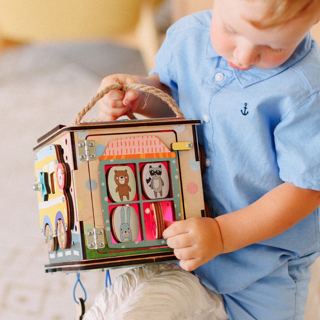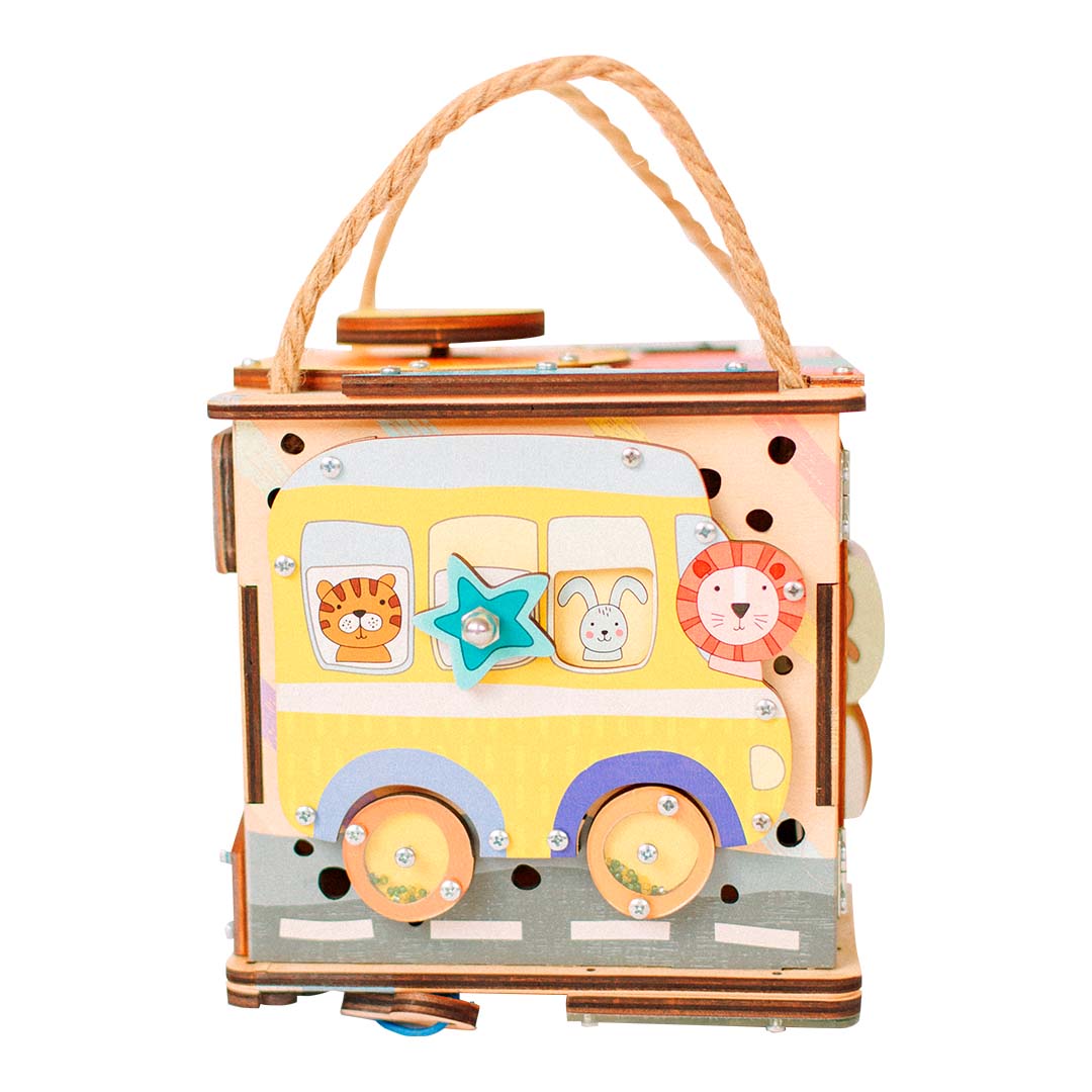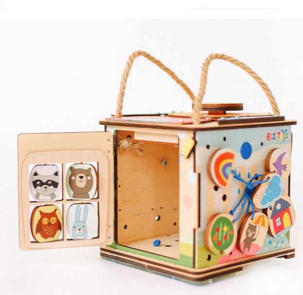 Дверка внутрь бизибокса закрывается на деревянный замочек. На самой дверке размещен домик с веселыми животными. Они закреплены на резиночке, поэтому животных можно вращать