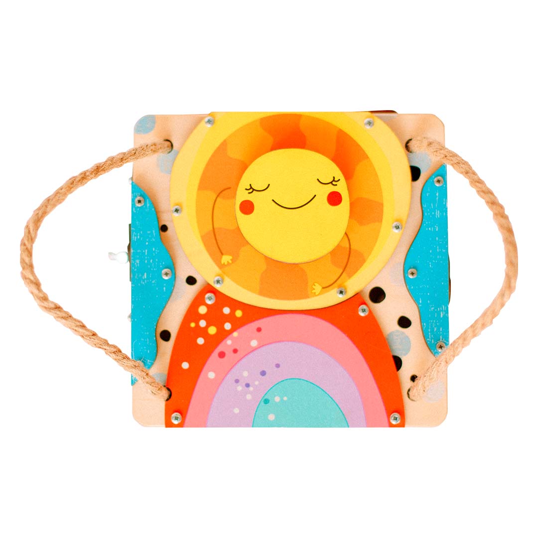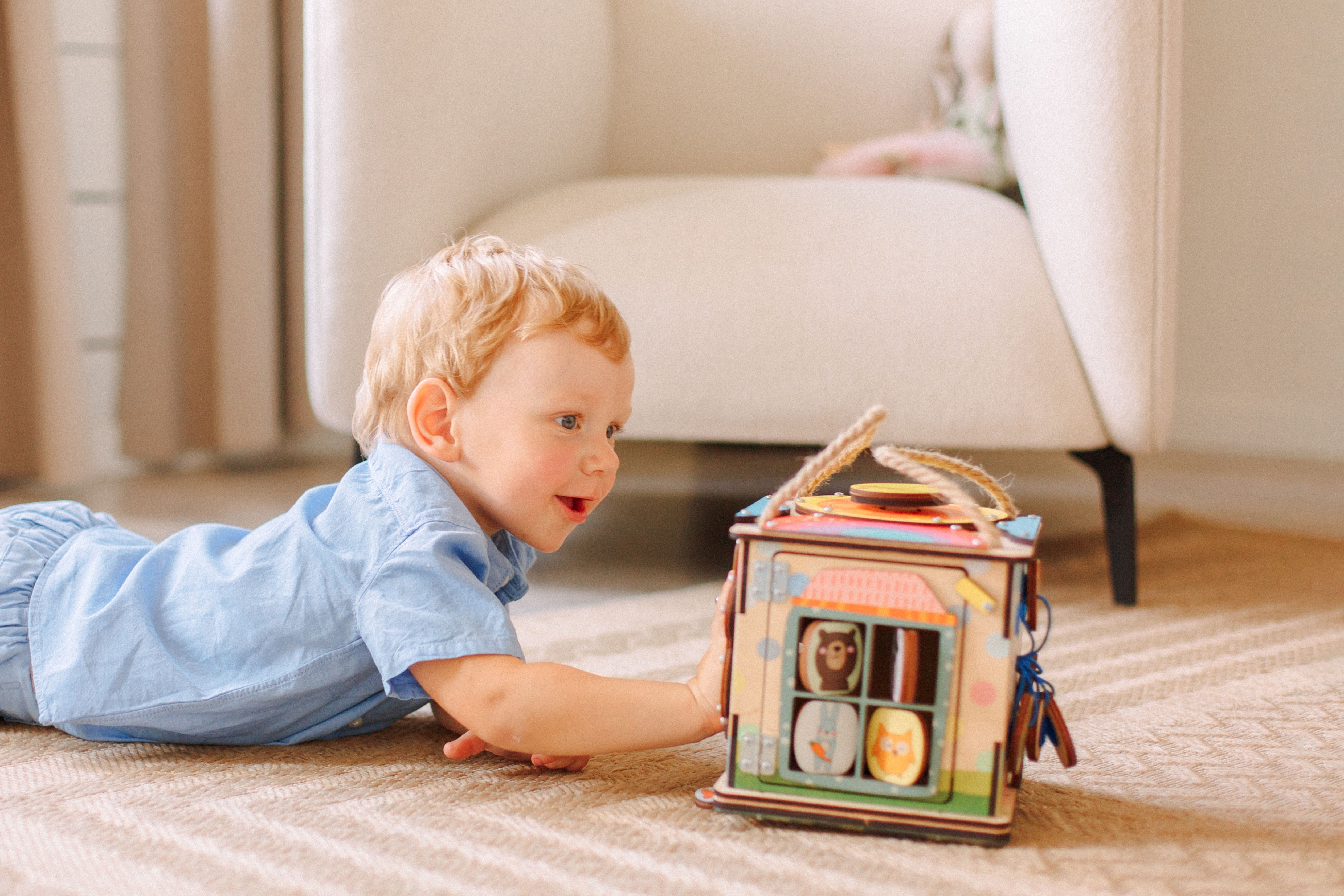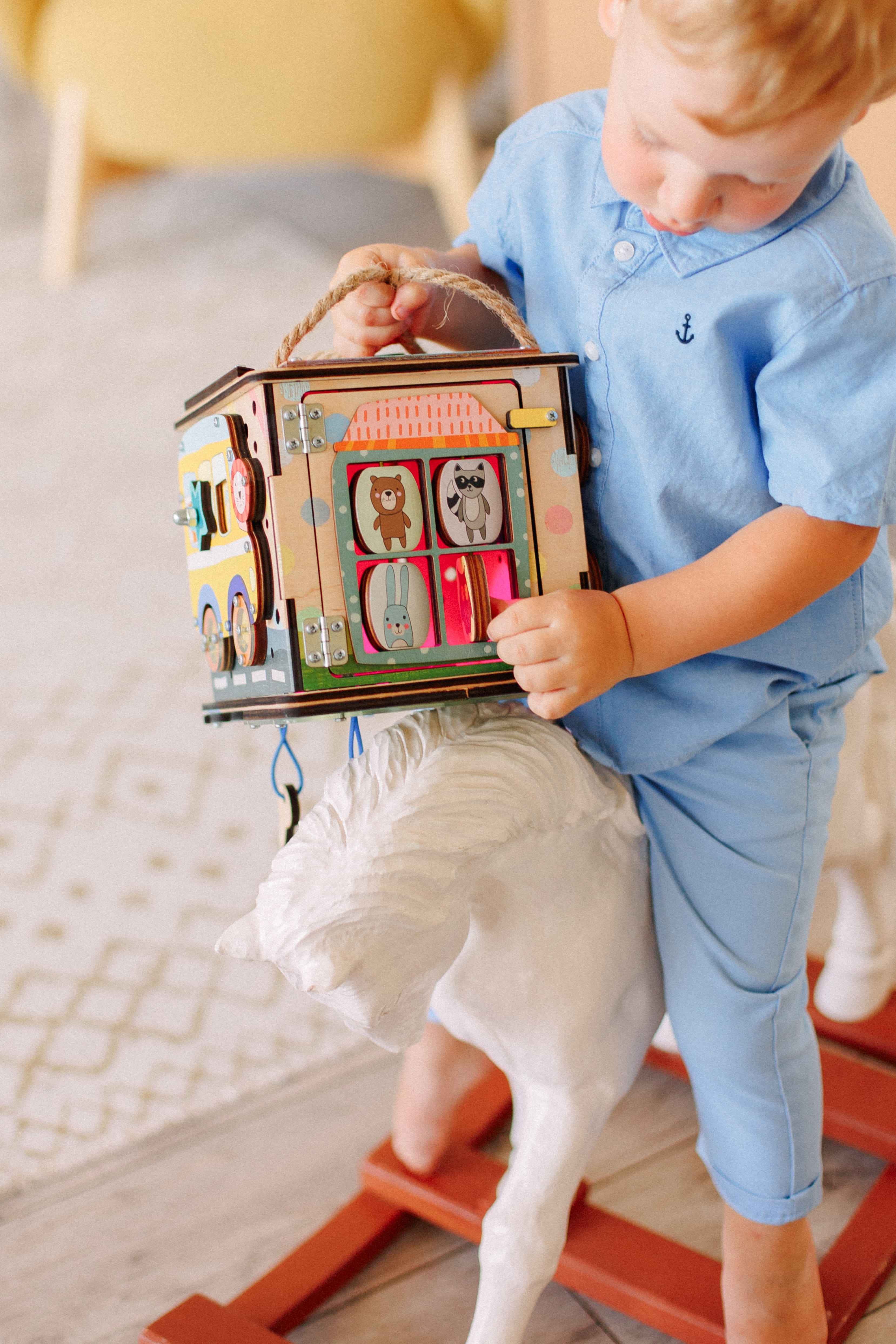 Дверка внутрь бизибокса закрывается на деревянный замочек. На самой дверке размещен домик с веселыми животными. Они закреплены на резиночке, поэтому животных можно вращать