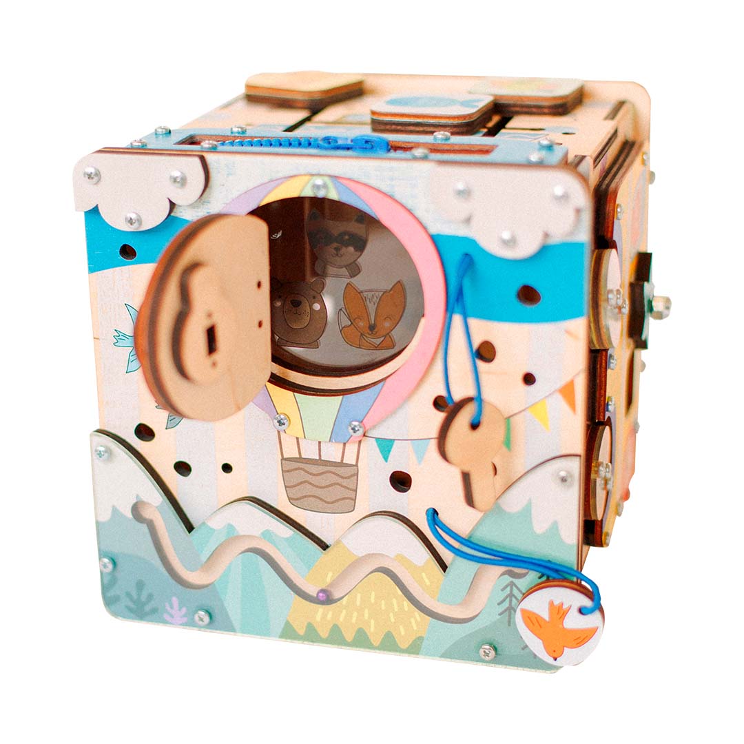 На воздушном шаре дверка. Она закрывается на маленький ключик, который закреплен рядом с ней на резинке. Внутри прозрачный лист пластика с нарисованными на нем зверятами.
