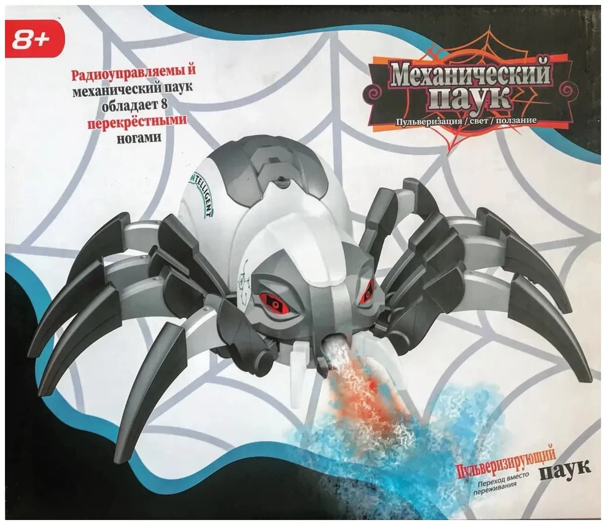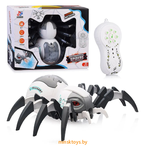 Игрушечный робот-паук на радиоуправлении. Функции: движение вперёд и назад, произвольное движение в разные стороны, выпускание пара с подсветкой, воспроизведение звуков и музыки. Команды задаются нажатием кнопок пульта. Во время игры глаза паука светятся мерцающим светом.
