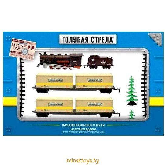 Комплект: паровоз, тендер, 2 контейнерных платформы, деревья, элементы пути.