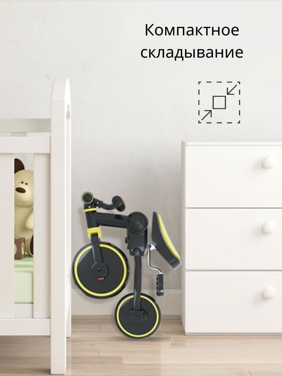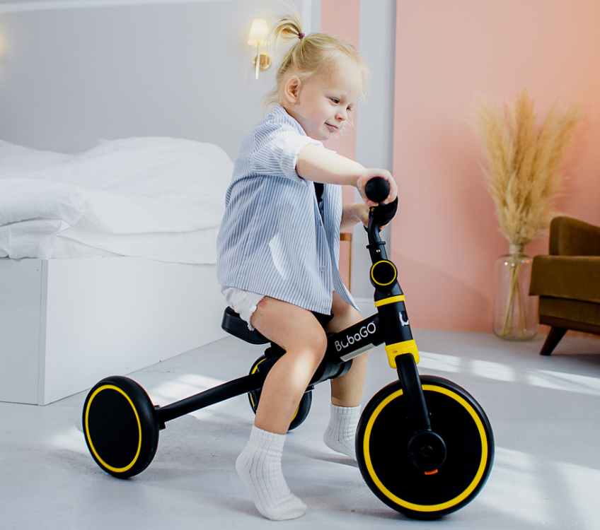 - Трансформер 4 в 1: двухколесный, трехколесный беговел и двухколесный или трёхколесный велосипед;