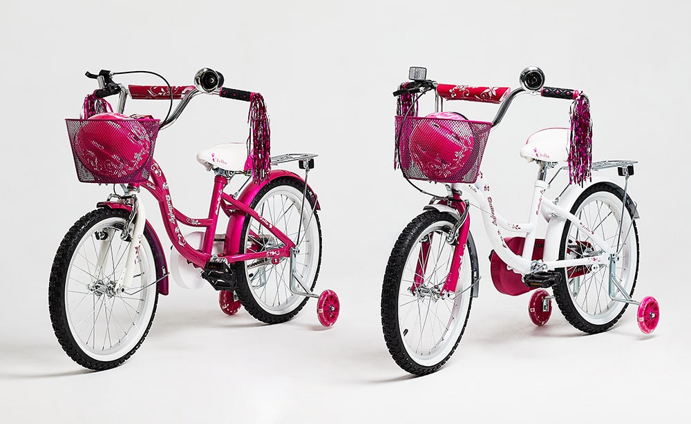 дополнительные приставные колеса, большая металлическая корзина, клаксон, шлем. |